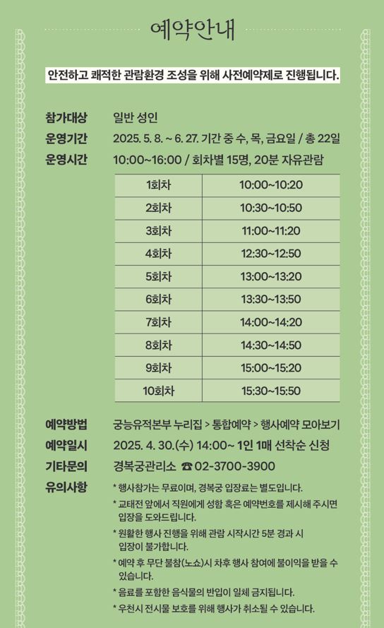 - 예약 방법: 4월 30일 오후 2시부터 궁능유적본부 누리집(royal.khs.go.kr)에서 선착순 접수