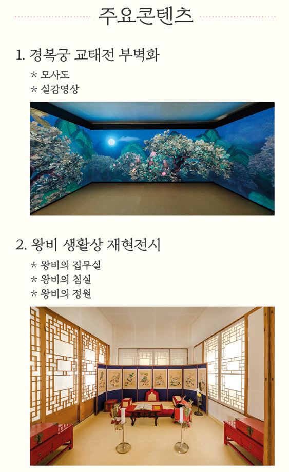 - 건순각 최초 공개: 교태전의 부속 전각인 건순각 내부를 처음으로 공개하며, 부벽화 속 동물을 주제로 한 실감 영상을 감상할 수 있습니다.