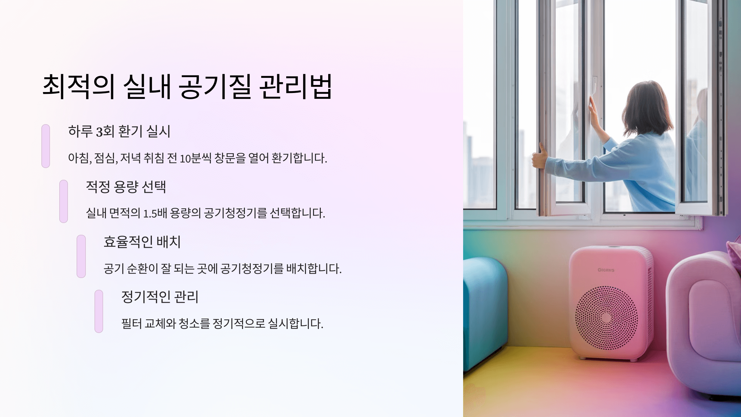 🔹 미세먼지 적은 날 → 자연 환기 + 공기청정기 병행