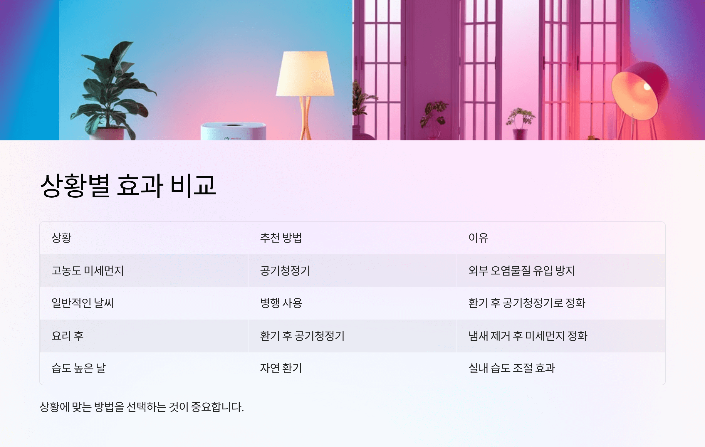아래 표를 통해 공기청정기와 자연 환기의 차이를 한눈에 비교해 보겠습니다.