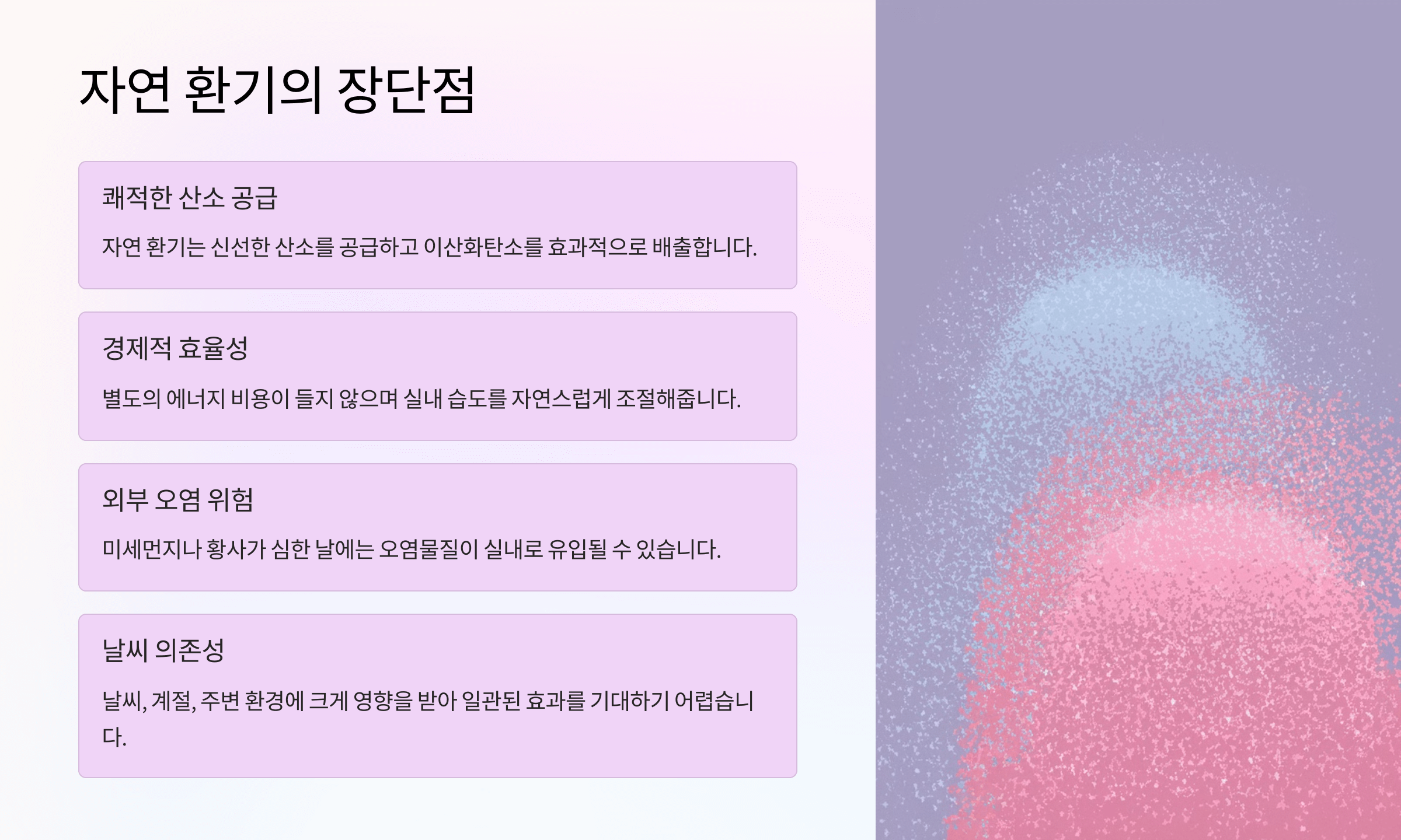 🔹 밀폐된 공간 → 공기청정기 필수 & 가습기 또는 식물 활용
