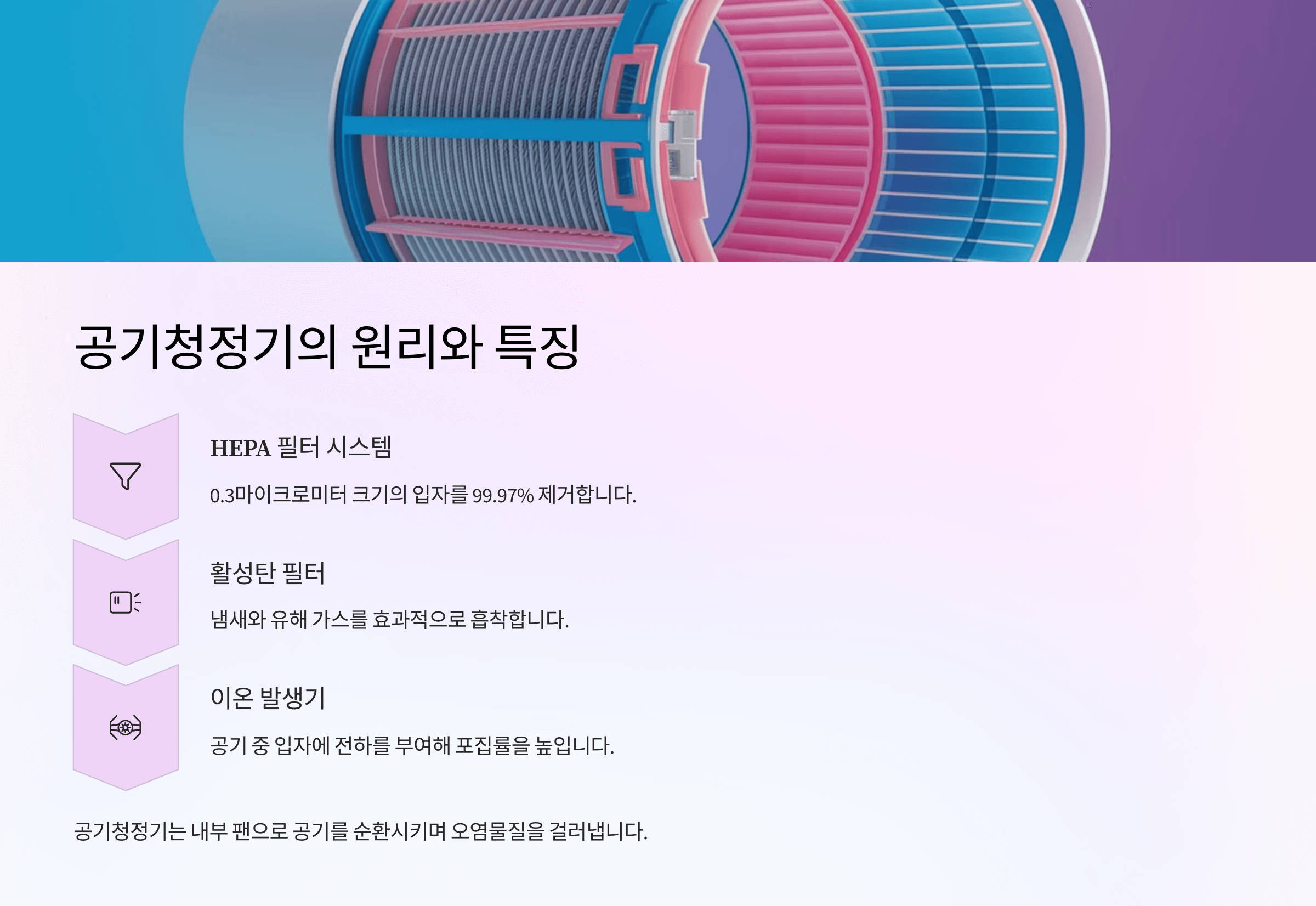 공기청정기는 미세먼지, 유해가스, 바이러스 등 공기 중 오염물질을 필터를 통해 제거하는 장치입니다. 주로 HEPA 필터, 활성탄 필터, 이온 발생기 등의 기술을 활용해 공기를 정화합니다.
