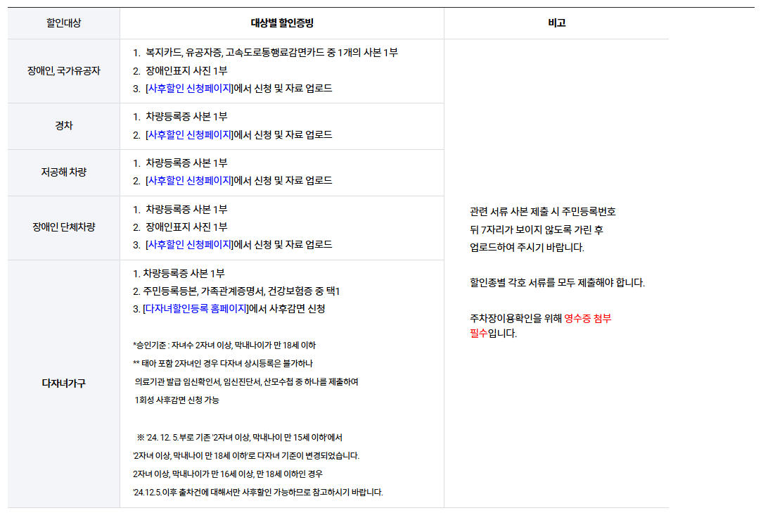 *(제출서류) 주민등록등본 사본, 가족관계증명서 사본, 건강보험증 사본 중 택 1> 행정정보 자동 확인이 안 될 경우 주차관리실(1544-7877)로 연락바랍니다.