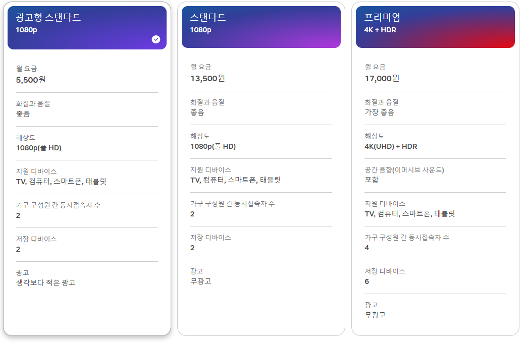 - 스탠다드 (FHD, 동시 2명) – 13,500원 (무광고)