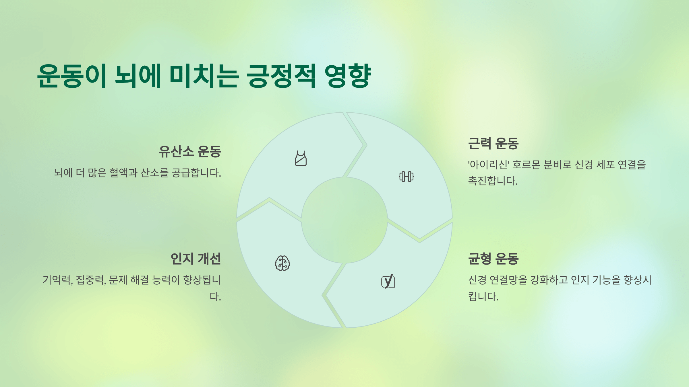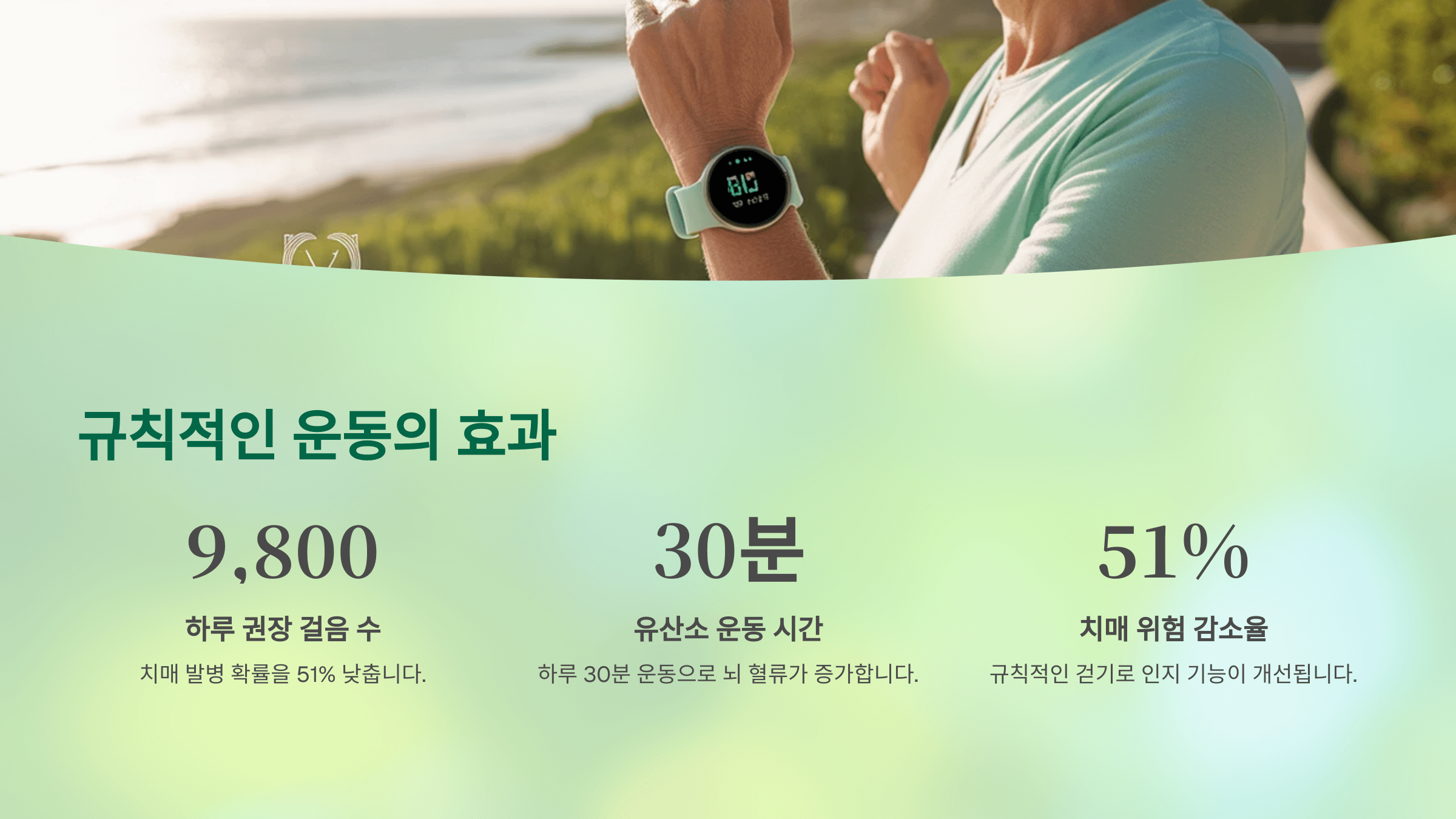 미국의학협회 저널 '신경학'(JAMA Neurology)에 따르면, 하루 9800보를 걷는 사람은 치매 발병 확률이 51% 낮아진다. 유산소 운동은 뇌에 더 많은 혈액을 공급해 뇌 기능을 활성화시키고, 근육에서 분비되는 '아이리신'은 신경 세포 간 연결을 촉진시켜 인지력을 향상시킨다.