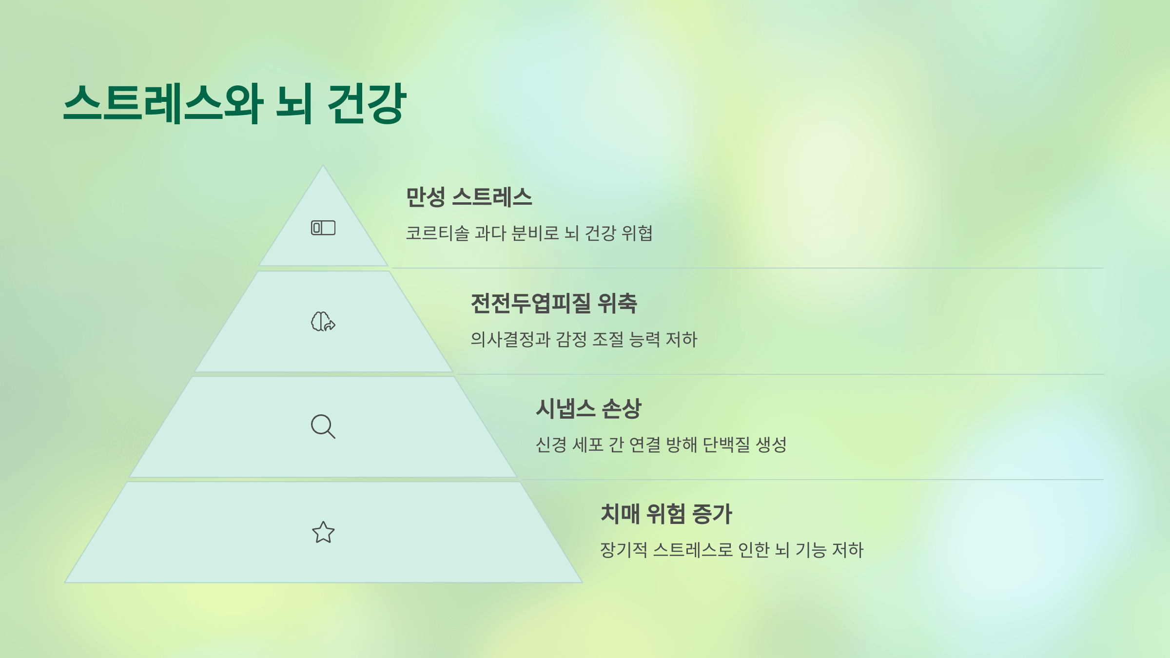 스트레스 호르몬인 코르티솔이 과도하게 분비되면 뇌의 전전두엽피질이 위축되고, 기억력이 급격히 떨어진다. 예일대 연구에 따르면 스트레스는 신경 세포 간 접합부(시냅스)의 성장을 방해하는 단백질을 생성해 치매 발병 위험을 높인다. 이를 방지하기 위해 명상, 요가, 심호흡 등 스트레스 관리법을 적극 실천하라.