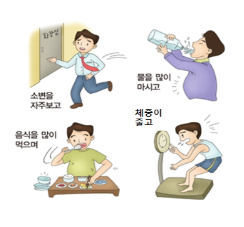 당뇨병에 걸리면 소변으로 포도당이 빠져나가는데, 이때 수분을 같이 끌고 나가기 때문에 소변량이 늘어납니다. 그 결과 몸 안에 수분이 부족하여 심한 갈증을 느끼게 됩니다. 또한 영양분이 몸에서 이용되지 않고 빠져나가므로 피로감을 잘 느낍니다. 또한 잘 먹는데도 불구하고 체중이 감소합니다.