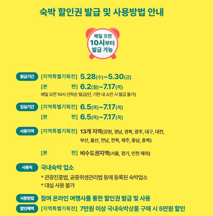 강원, 경남, 경북, 광주, 대구, 대전, 부산, 울산, 전남, 전북, 제주, 충남, 충북 등 - 사용 기간: 6월 5일 ~ 7월 17일까지 입실하는 숙소에 한함