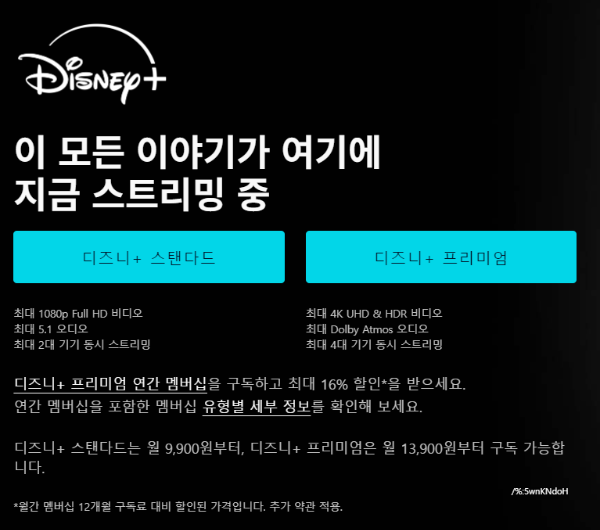 - 스탠다드 요금제: 월 9,900원 → 연간 99,000원 (2개월 무료 효과) , FHD 화질(1920x1080) ,동시시청 인원은 2명