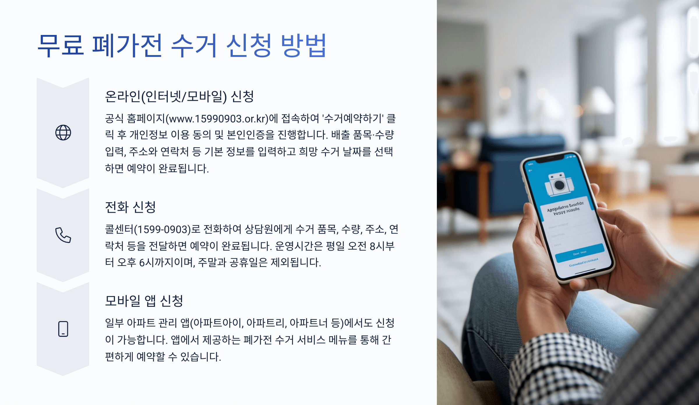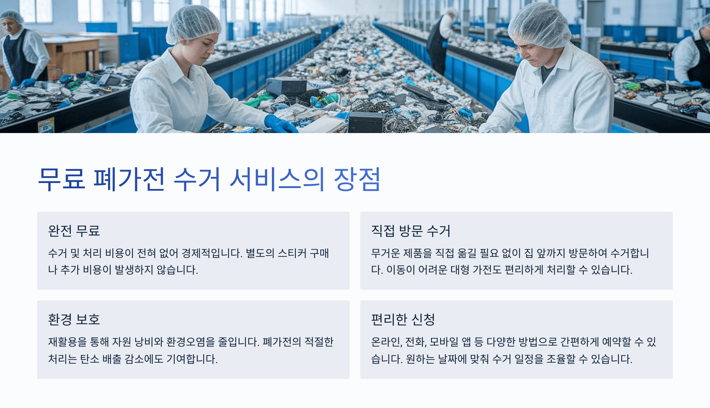 무료 폐가전 수거 서비스는 냉장고, 세탁기, TV, 에어컨 등 대형 가전제품부터 소형가전까지 집 앞까지 방문해 무료로 수거해 가는 정부 공식 서비스입니다. 2025년 기준 최신 정책과 신청 방법, 수거 가능 품목, 주의사항, 자주 묻는 질문까지 구글 SEO에 최적화된 형식으로 상세하게 안내합니다.