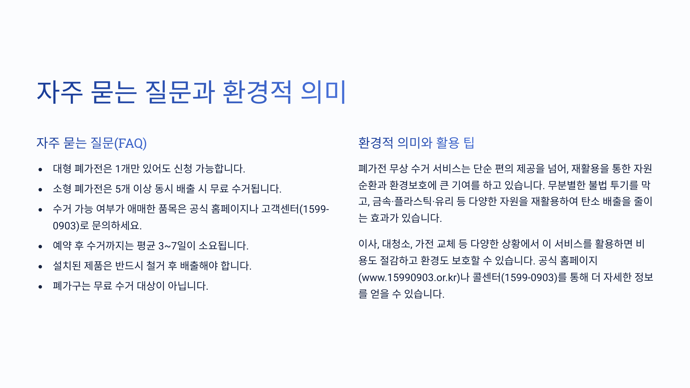 - 절차: 상담원 연결 → 수거 품목, 수량, 주소, 연락처 등 전달 → 예약 완료