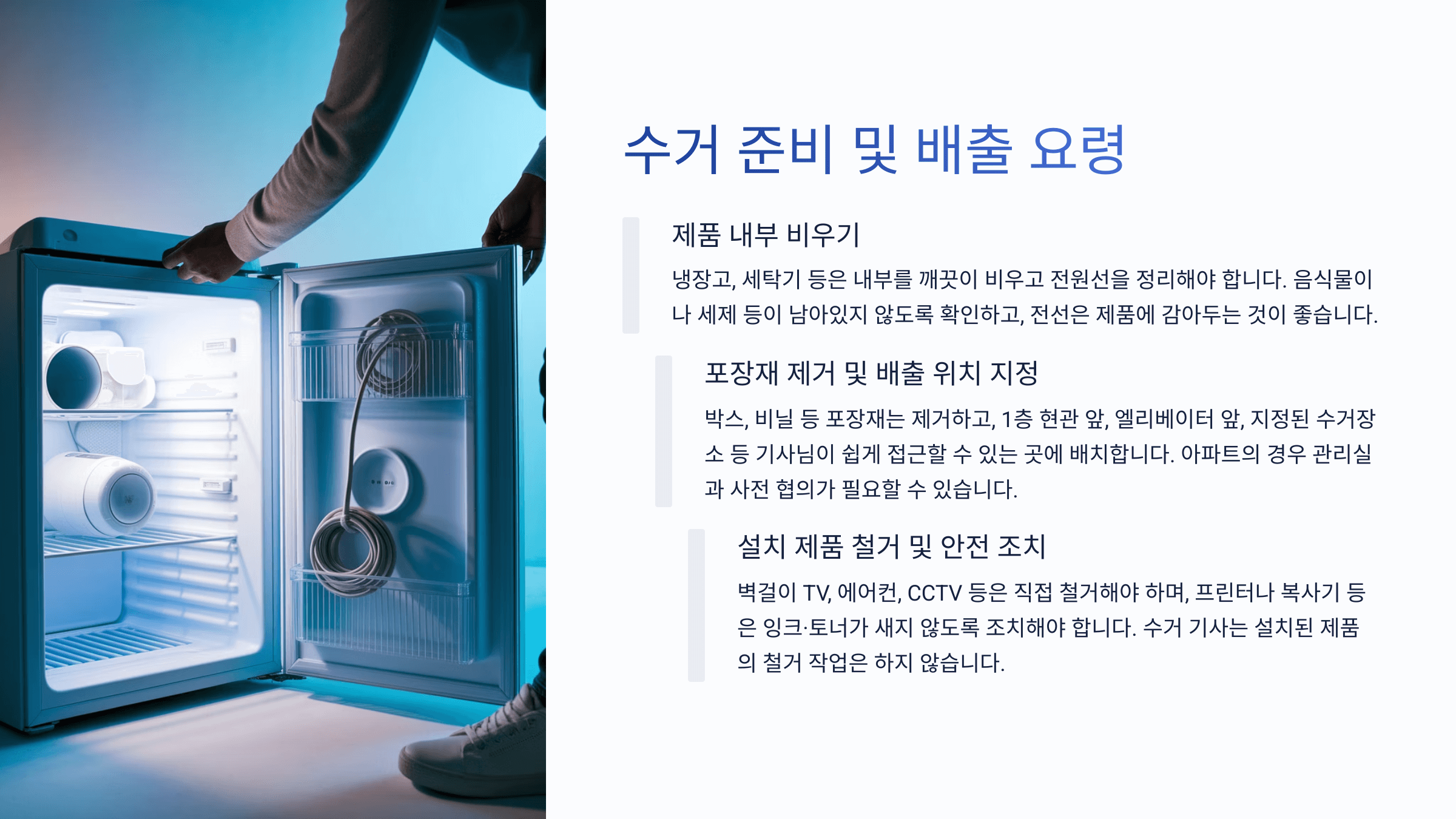 - 수거 불가 상태: 분해·훼손·위험 위치·사다리차 필요 등은 수거 불가