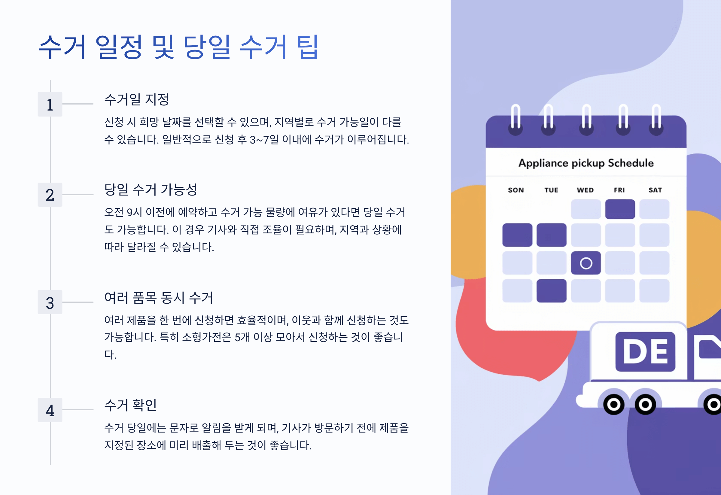 - 수거일 지정: 신청 시 희망 날짜 선택 가능(지역별 수거 가능일 상이)