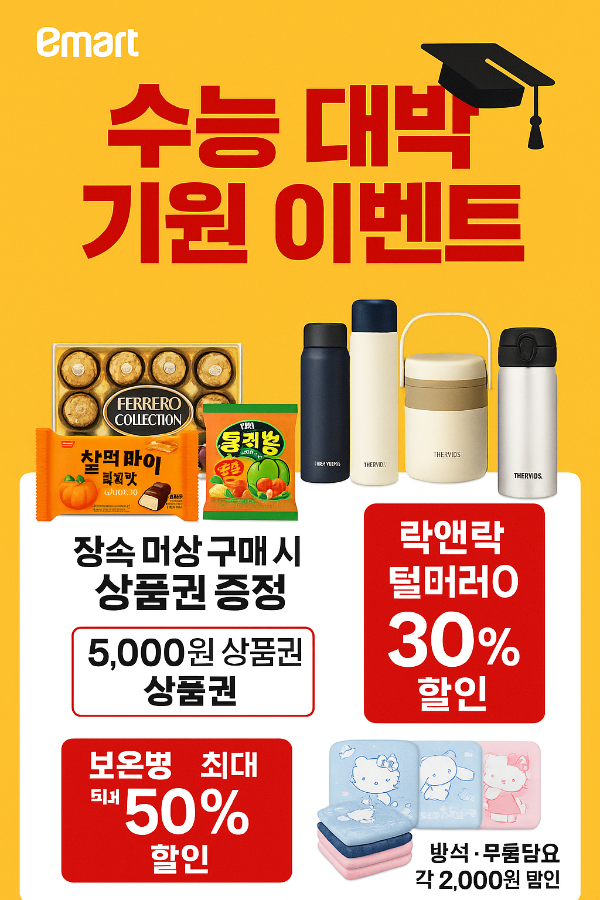 🎓 이마트, 수능 대박 기원 할인행사! 보온병·초콜릿·핫팩 최대 50% 할인 🛍
