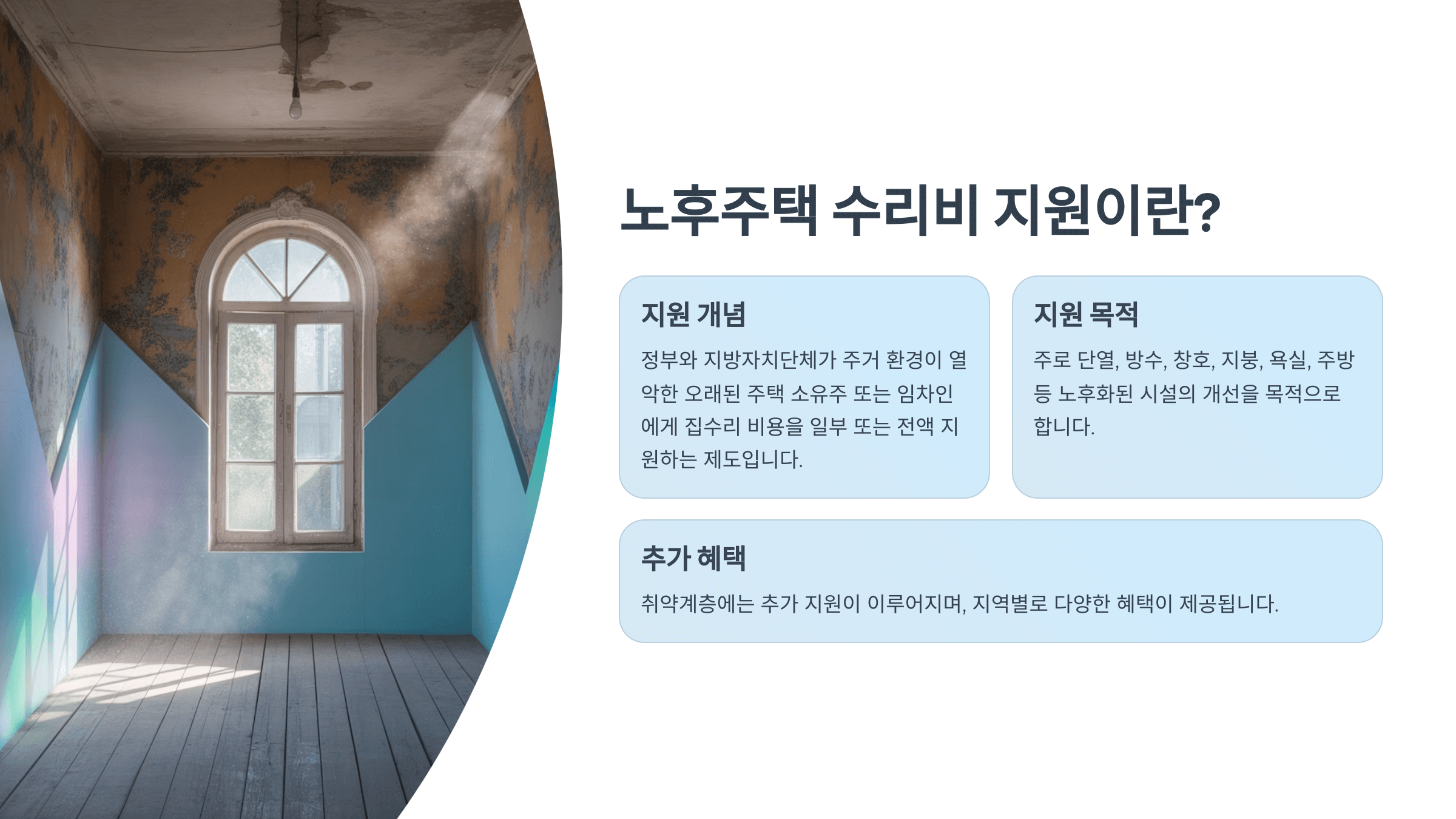 노후주택 수리비 지원으로 쾌적하고 안전한 주거환경을 만드세요. 2025년, 내 집 리모델링의 기회! 지금 바로 신청 준비를 시작하시기 바랍니다.