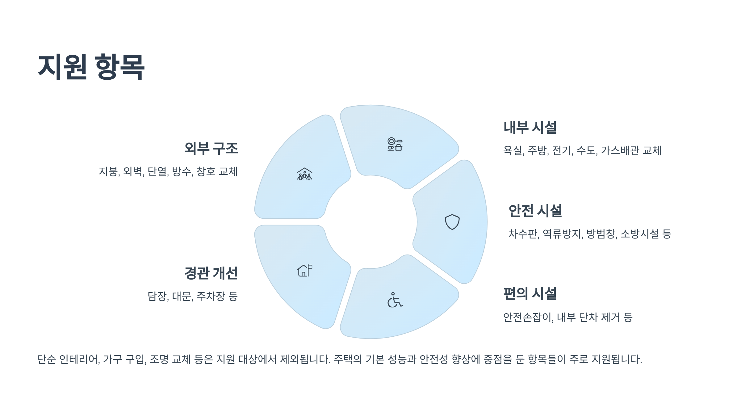 기본적으로 단열, 방수, 창호, 안전시설 등 주택 성능 개선이 목적이며, 단순 인테리어는 제외됩니다.