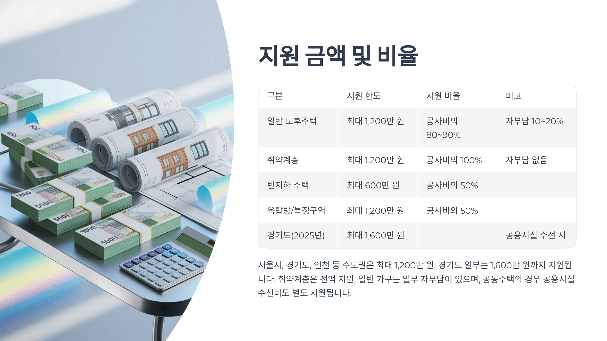 | 반지하 주택 | 최대 600만 원 | 공사비의 50% | |