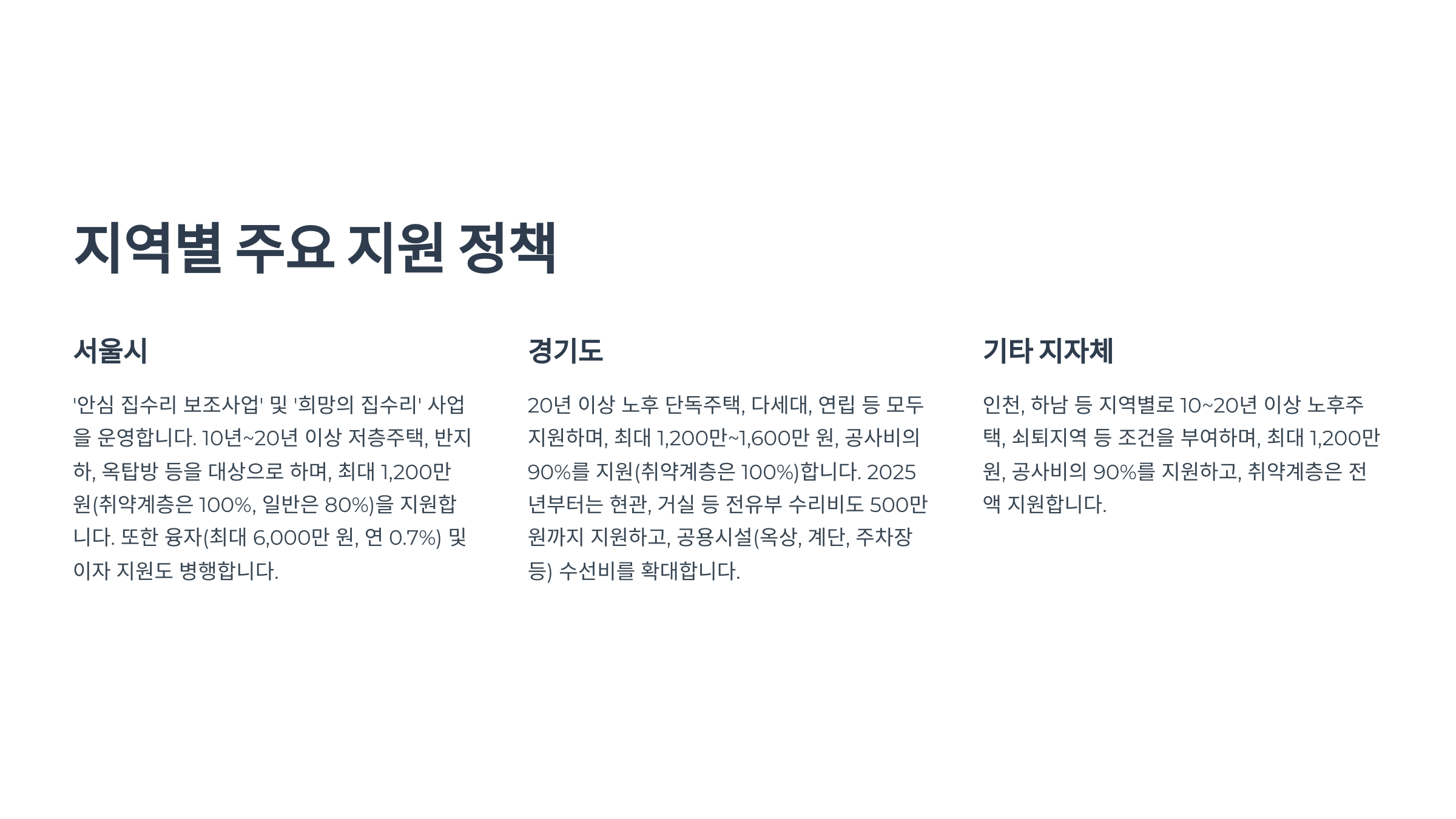 - 최대 1,200만~1,600만 원, 공사비의 90% 지원(취약계층은 100%)