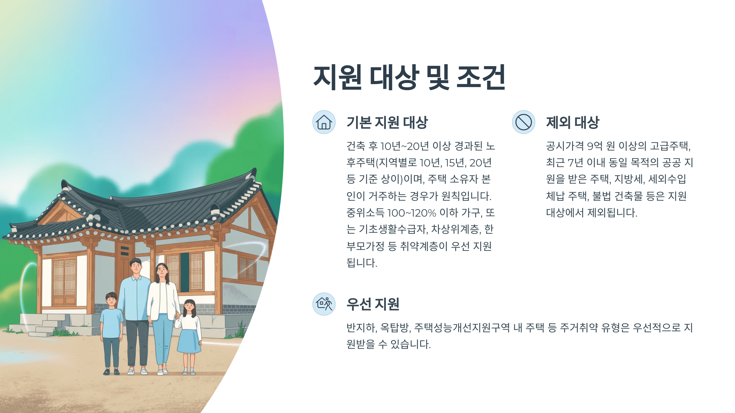 - 10년~20년 이상 저층주택, 반지하, 옥탑방 등 대상