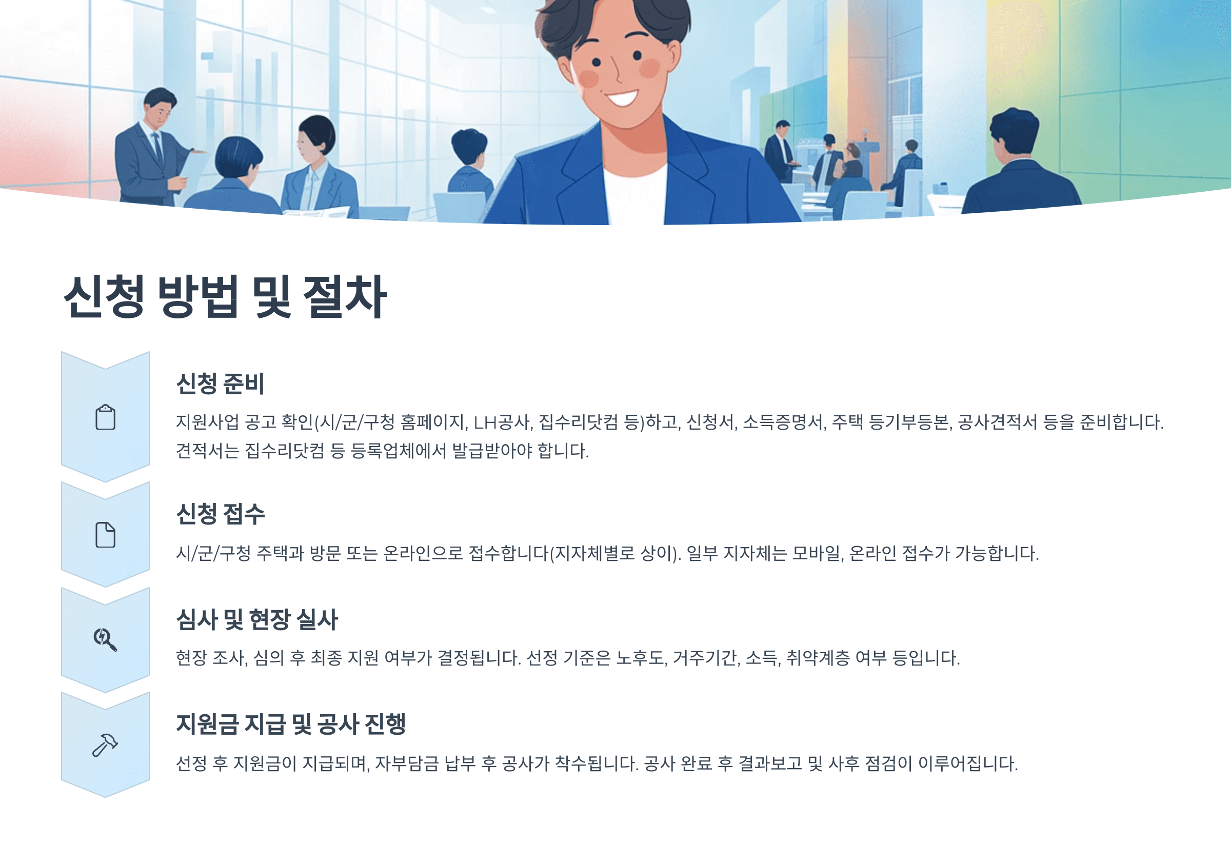 공사 견적, 심사 후 선정되면 자부담금 납부 후 지원금이 지급되며, 일부는 공사 완료 후 정산됩니다.