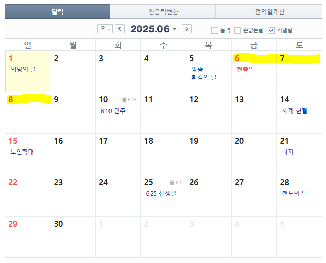 -. 주말과 붙어 총 3일 연휴(6/6~6/8)