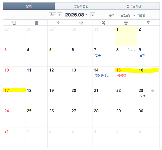 2) 8월 15일(금) 광복절 연휴 (3일 연휴)