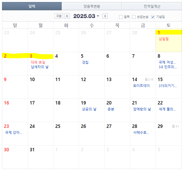 1) 3월 1일(토)~3일(월) 삼일절 연휴 (대체휴일 적용)