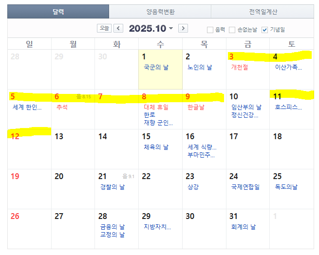 1)10월 3일(금) 개천절 ~ 10월 9일(목) 한글날 (추석 포함)