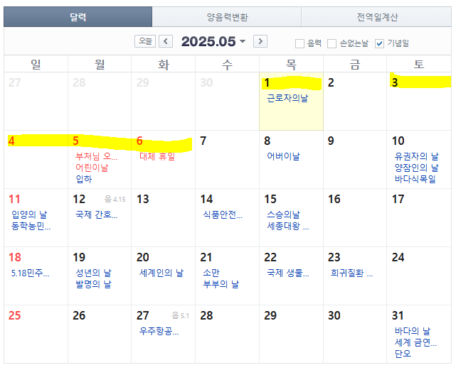 -. 주말 포함 4일 연휴(5/3~5/6)