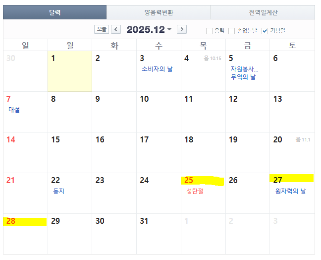 3) 12월 25일(목) 성탄절 연휴 (연차 사용 시 연말 연휴 가능)