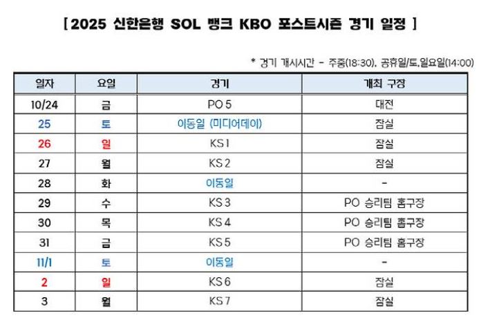 | 플레이오프 | 10월 18일 ~ 24일 | 한화 vs 삼성 | 5전 3선승제 |