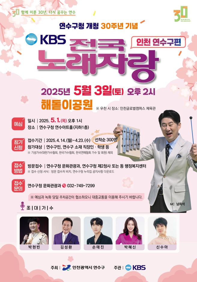 연수구청 개청 30주년 기념으로 KBS 전국노래자랑 인천 연수구편이 오는 2025년 5월 3일(토) 오후 2시, 해돋이공원에서 성대하게 펼쳐집니다.